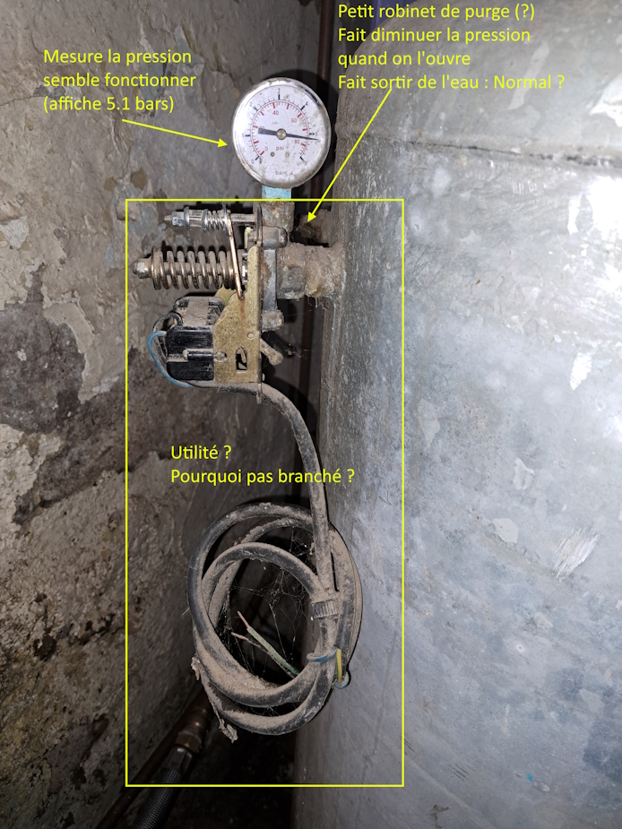 2 - Derrière et en haut du reservoir, j'ai un petit robinet (genre WC) d'où sort de l'eau sous pression si je l'ouvre. C'est normal ? Ca ne devrait pas être de l'air qui sort ? Ca fait baisser la pression sur le manomètre situé à côté si je l'ouvre.