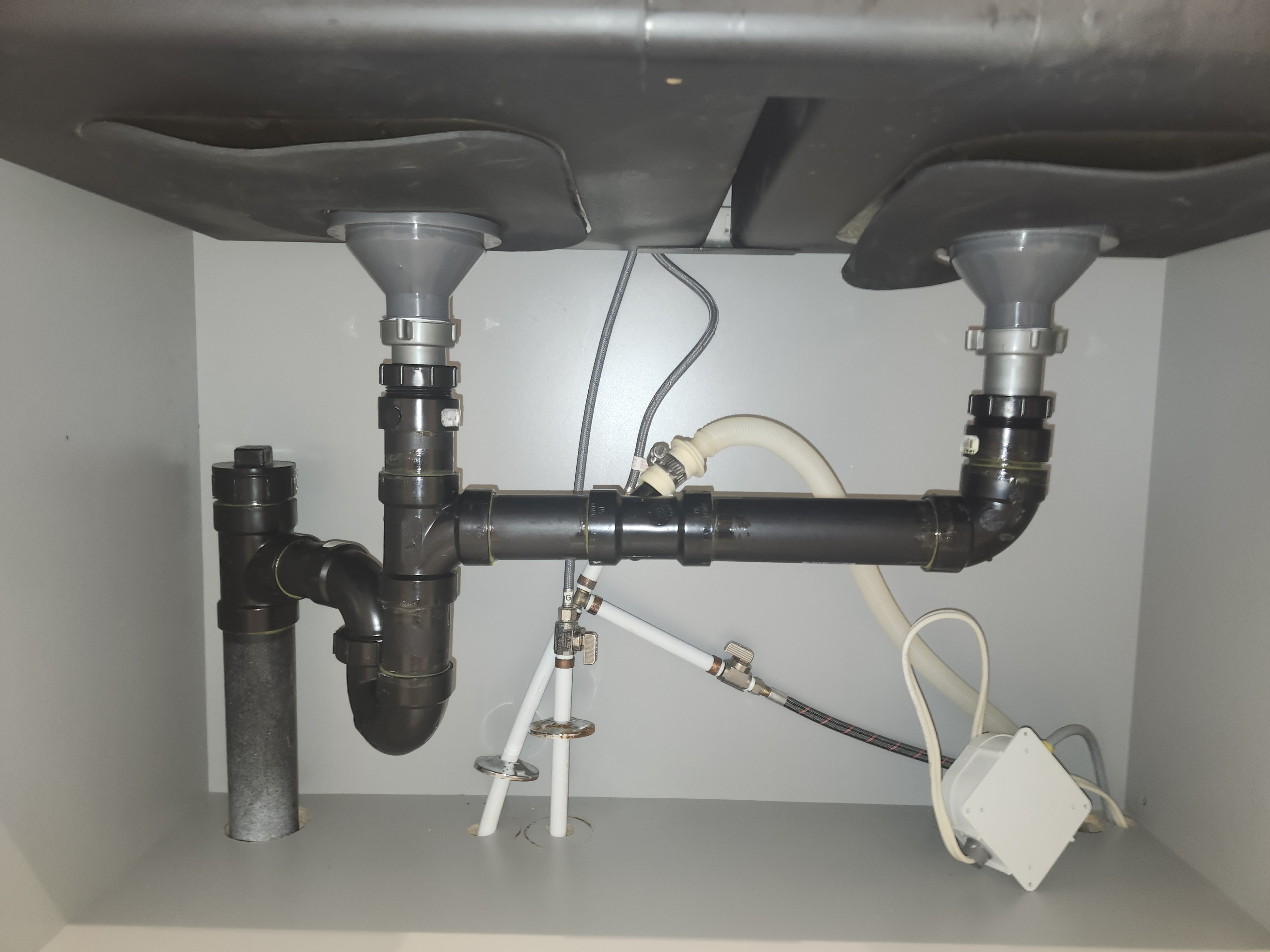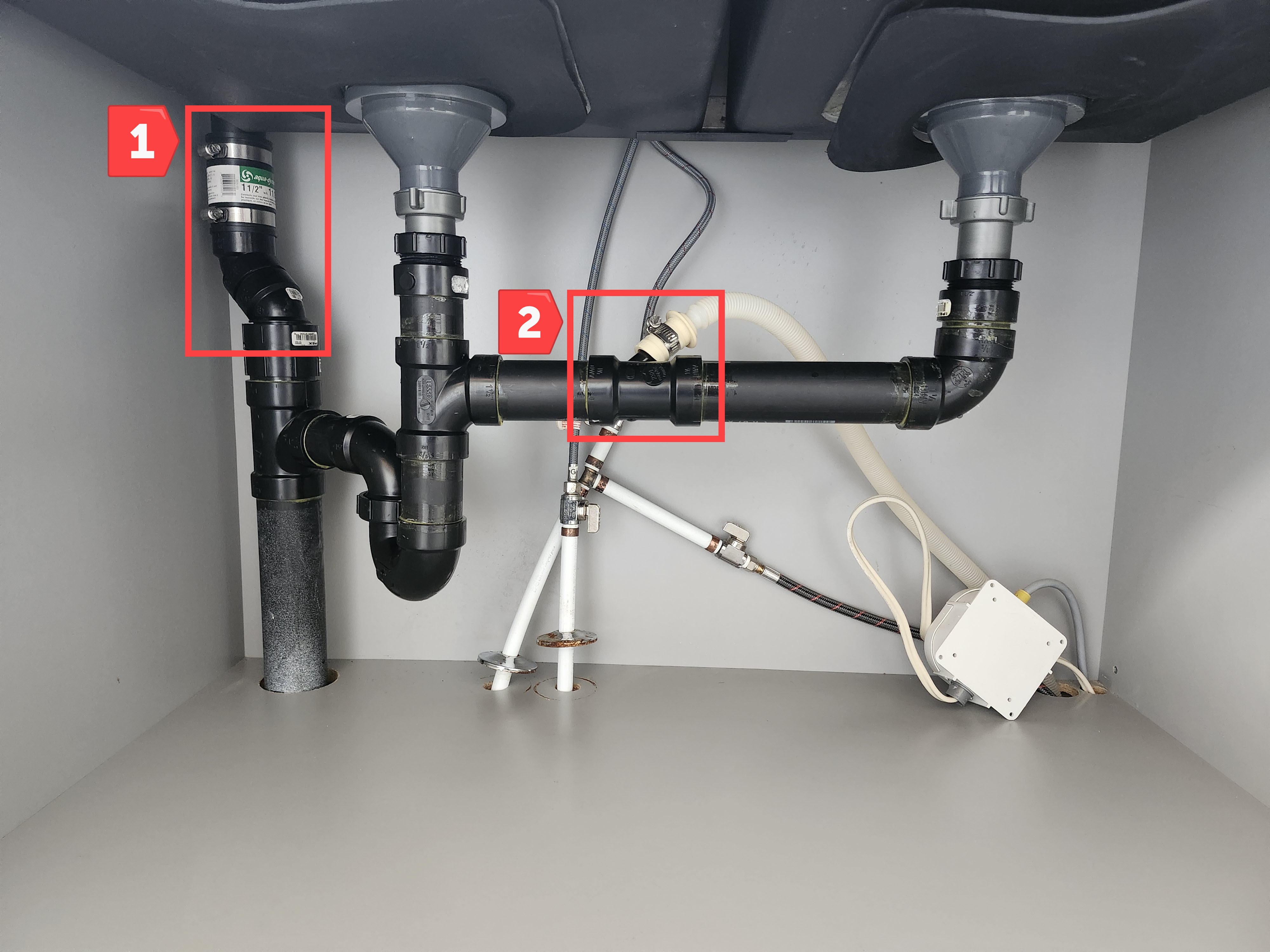 Mon raccord pour l'évacuation de lave-vaisselle est placé entre les éviers (section 2 sur la photo 2).