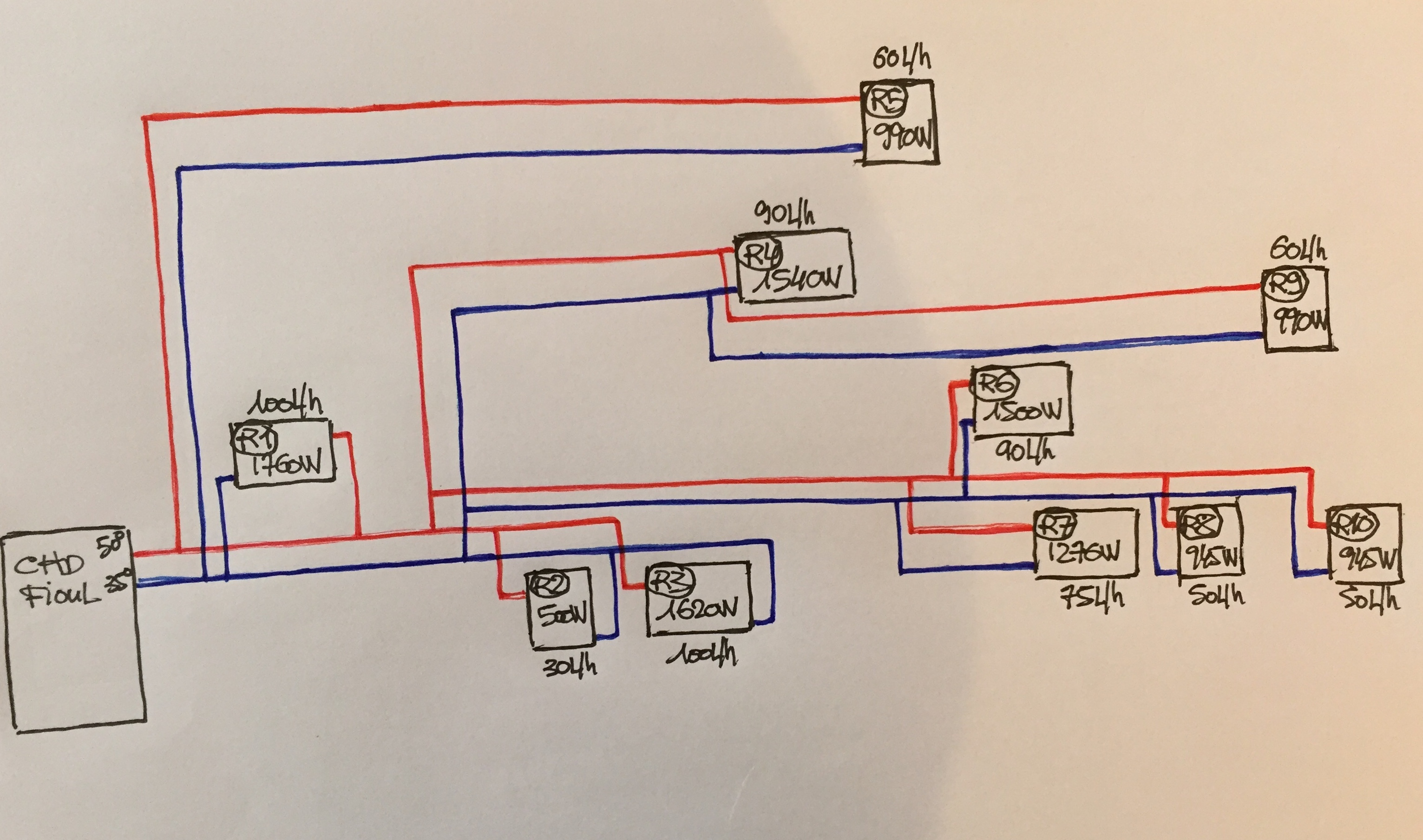 Pour le radiateur R9, dois-je additionner les pertes de charge des tronçons allant vers tous les radiateurs excepté le R10 ? Si qq'un peut me confirmer ces doutes d'après le schéma joint ce serait sympa