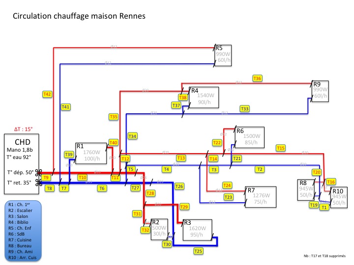 J'ai besoin d'équilibrer mon circuit suite aux remplacements et ajouts de coude de réglage. Tous les radiateurs chauffent correctement mais certains ont tendance à baisser lorsque j'en allume d'autres (ex : qd j'allume R4 les radiateurs R7, R8 et R9 baissent en température). Mon installation est désembouée et purgée, je me lance dans le calcul des pertes de charges