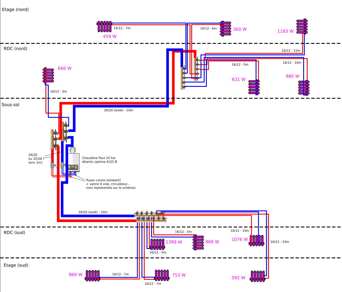 Mon autre interrogation, dans les deux cas, c'est avec quel diamètre reprendre sur les vannes existantes de ma chaudiere ? (le tuyau qui ira des vannes à la nourrice principale ou au Té selon la solution choisie). Actuellement, c'est du cuivre en 28 qui sort, ce qui il me semble correspond à du 32/26 en multicouche. J'hésite donc à avoir environ 1m de 32/26 jusqu'a la séparation des distributions en 26/20, ou à rester 26/20 meme en sortie de chaudiere... Le 32/26, ca m'a l'air un peu plus compliqué à travailler, les raccords sont plus chers, etc... Mais si c'est ce qu'il faut, j'irai pour cette solution. D'un autre côté, de ce que je vois des autres réseaux de chauffage, j'ai l'impression que c'est très rarement utilisé pour des installations résidentielles de cette taille.