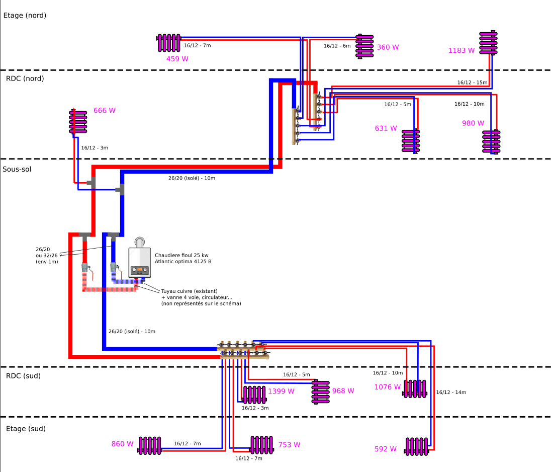 Je rénove une maison des années 1980 en Bretagne d'environ 140m2. La maison n'était jusqu'à ce jour pas du tout isolé (40cm de murs béton en RDC... ca n'isolé pas, mais ca résiste bien aux tempetes), en dehors des rampants. Je suis donc en train de faire une isolation par l'intérieure, et j'en profite pour refaire le réseau de chauffage, en profitant des futures cloisons pour faire passer une partie du réseau. Le réseau d'origine est en cuivre, en grande partie encastré dans les dalles RDC / étage. Les radiateurs sont en fonte type rideaux. J'ai estimé leurs puissances en me basant sur un site qui proposait à la vente des modèles similaires (meme type et memes dimensions) et donnait leur puissance (j'imagine en delta T50, vu que ce n'était pas précisé). Au passage, je compte rajouter un radiateur supplémentaire de 900W (acier cette fois), et remplacer les 2 petits radiateurs fontes des deux SDB (300W et 360W d'origine) par des seches serviettes mixtes (640W et 460W). Le système de chauffage (+ ECS) est une chaudiere fioul Atlantic Optima condens 4125 B, que je compte aussi changer mais un peu plus tard, apres les travaux d'isolation, histoire d'étaler les frais.