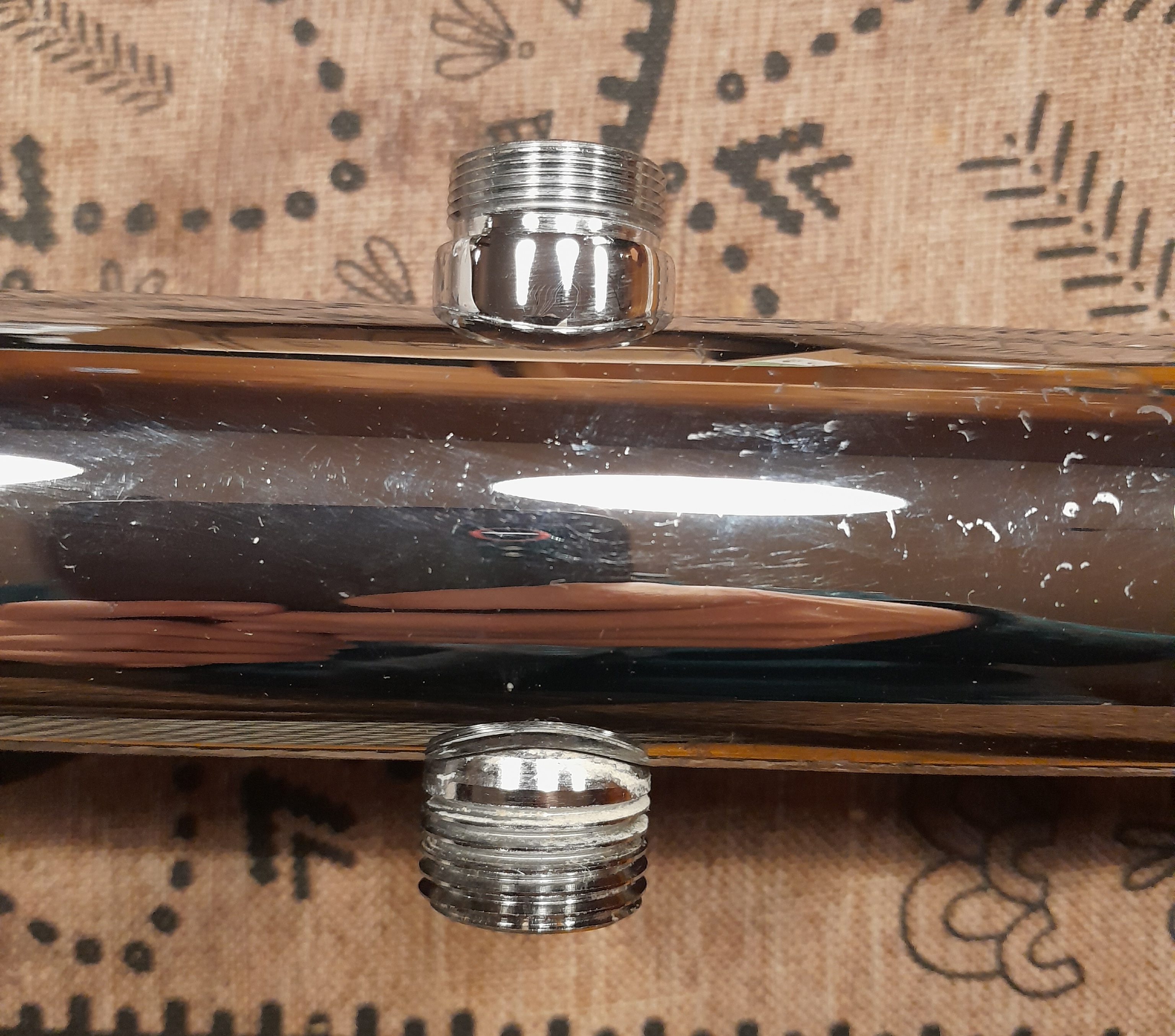 Après quelques mois, mon mitigeur thermostatique est hs, je décide donc d'en installer un mécanique. A priori la sortie haute pour la colonne est du 1/2, sauf qu'en installant mon nouveau mitigeur je constate que le pas de vis ne va pas : il est bcp plus serré.