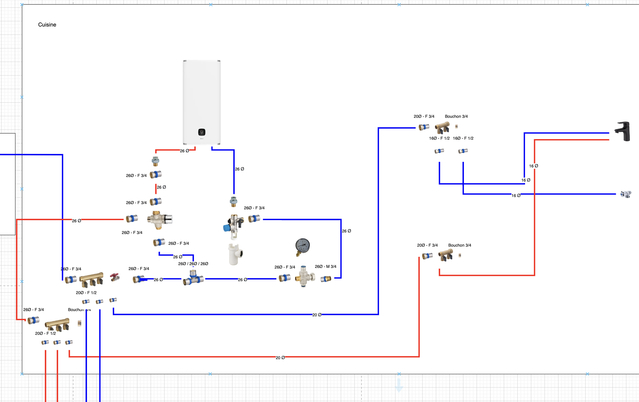 Pour les lignes d'eau chaude, il ne faut pas surdimensionner, un tuyau de 20 en sortie de ballon est normalement suffisant, pour alimenter jusqu'au deux salles de bains, plus le tuyau est gros et plus le ballon est éloigné des points de consommation, et plus vous aurez du gaspillage d'eau chaude et de l'inconfort au niveau de l'attente d'eau chaude.