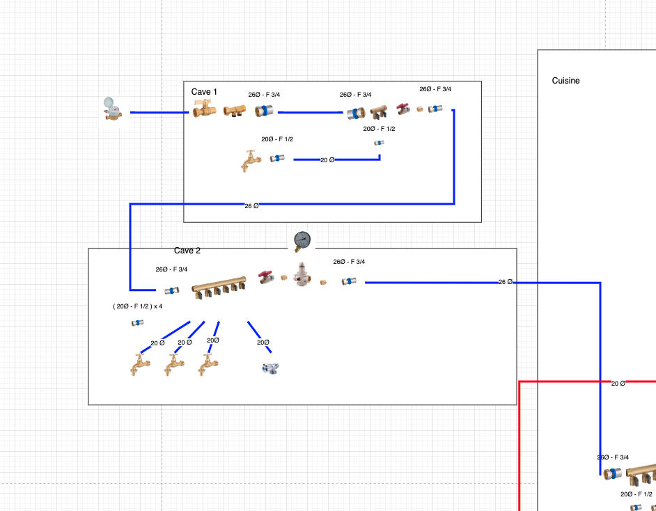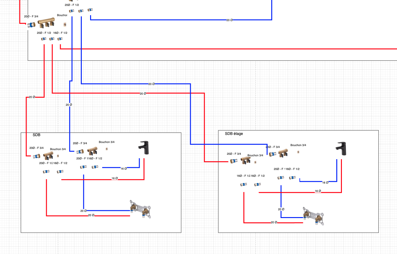 Je prendrais toutes les alimentations externes avec des tuyaux de 20 car les pertes de charge sur le 16 sont assez importantes, je prendrais aussi ces alimentations avant le réducteur de pression...