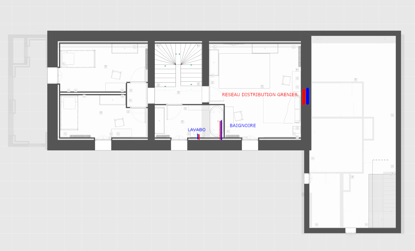 Nous venons d'acquérir une maison très ancienne sur deux étages avec une extension accolée, ou les réseaux sont repiqués et je voudrais partir sur un nouveau réseau en cuivre recuit avec des vannes. Dans un premier temps, nous n'aurons les moyens que de faire la partie maison, tous les réseaux de l'extension seront faits plus tard, mais je les ai indiqués pour avoir une vision d'ensemble.