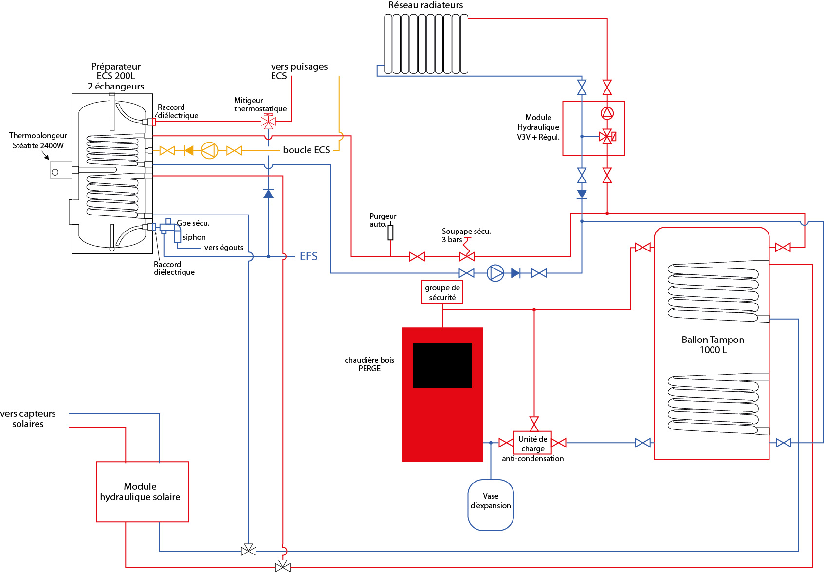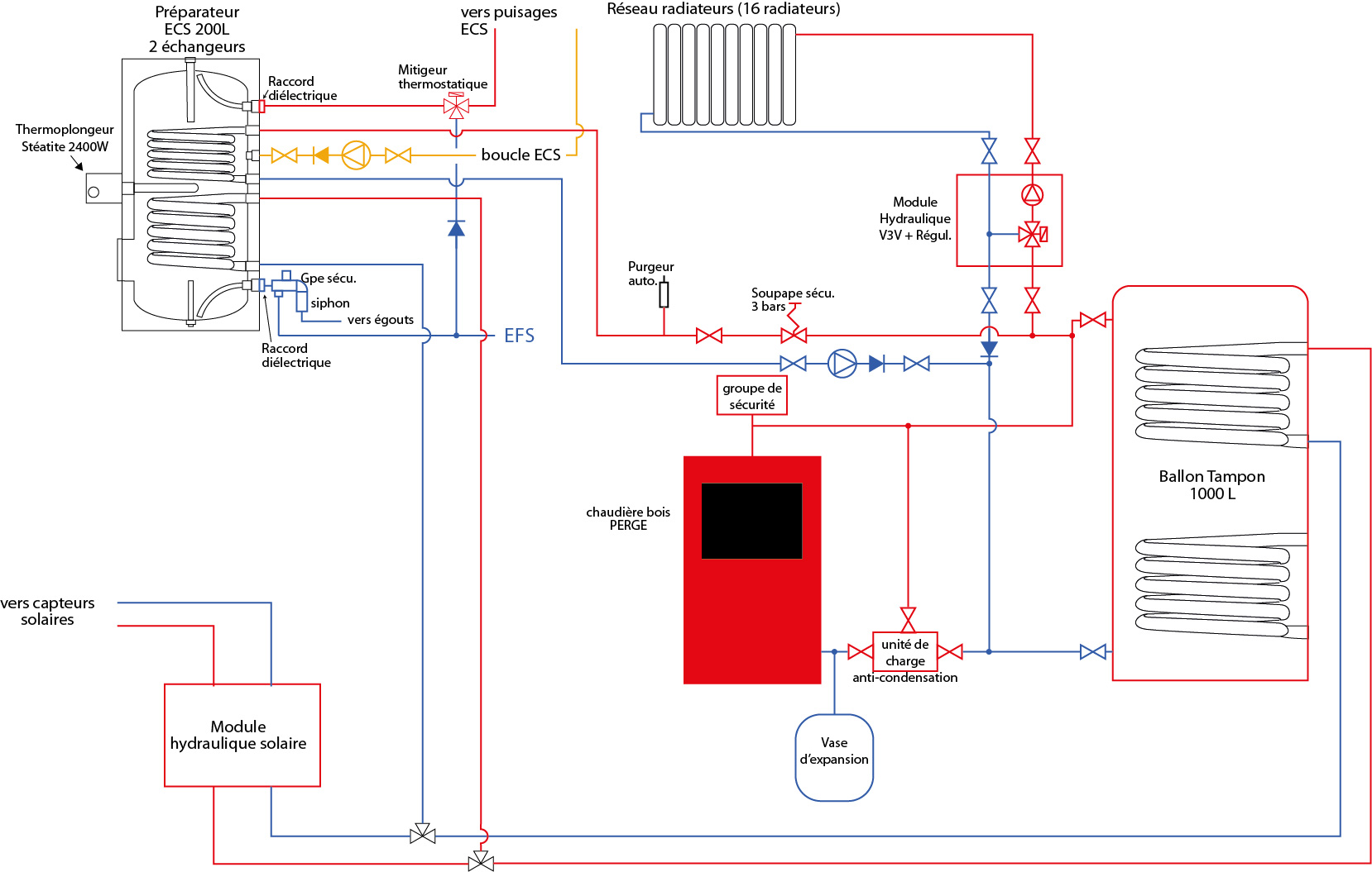 L'idée serait dans un premier temps de retirer la chaudière fuel et de placer un ballon tampon de 1000L pour la chaudière bois ainsi qu'un préparateur d'ECS de 200L neuf en remplacement du ballon actuel.
