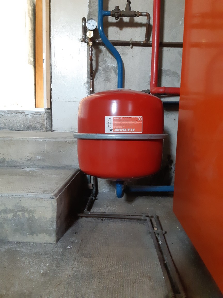 Le vase d'expansion ci-dessous est en retour de circuit juste avant la chaudière (ok) alimenté par le tuyau bleu qui arrive derrière lui, mais par le bas.