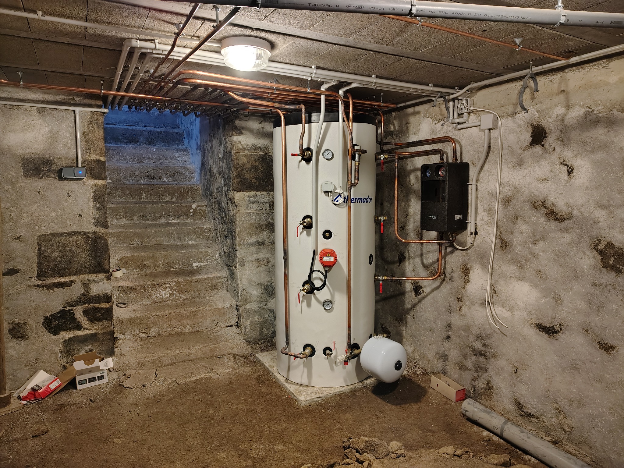 - résistance électrique triphasée 6kW pour appoint et prod ECS estivale via panneaux PV (mon installation ne se prêtait pas à réaliser du solaire thermique: le seul toit ensoleillé est trop éloigné de la chaufferie, j'aurais trop de pertes en ligne. Dans mon cas, le rendement global sera meilleur en électrique).