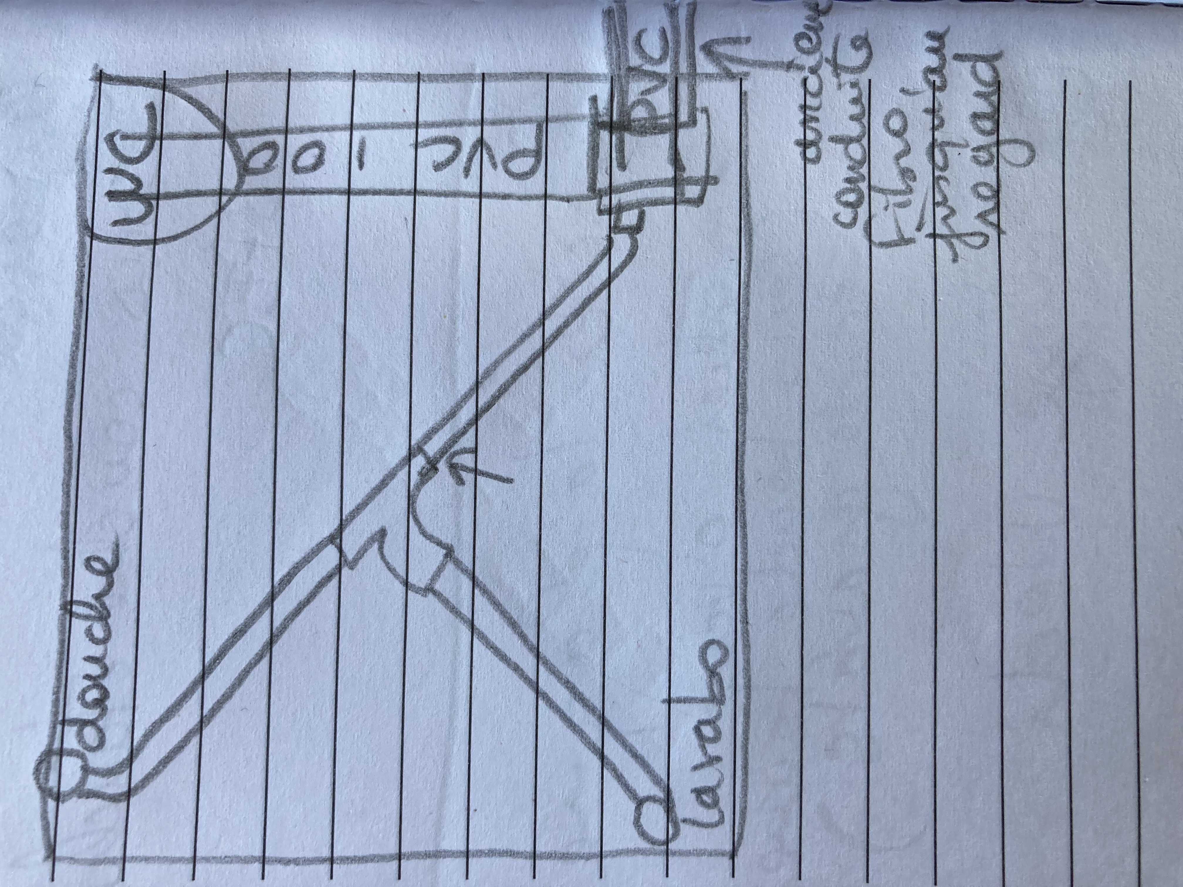 -nous avons coller un bouchon de reduction avec une sortie de 40 mm, un tuyau, un pied de biche dont un tuyau va jusqu à la douche et l autre le lavabo.