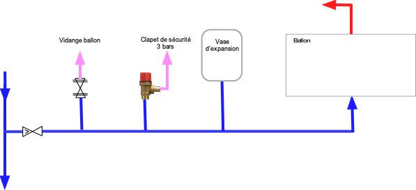 Remarque – Il est exclu pour moi d'utiliser un groupe de sécurité intégré: mon installation est très spéciale (capteurs solaires thermiques alimentant un ballon de 300 l horizontal), et je dois installer un vase d'expansion en rattrapage.)