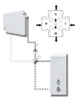Sur l’image d’illustration, on aperçois un circuit pointillé sur le retour, c’est la différence entre la vanne 3 et 4 voies, sur ce schéma c’est donc l’eau du retour a laquelle un peut d’eau du départ est mélangé afin que l’eau ne rentre pas trop froide sur la chaudière.