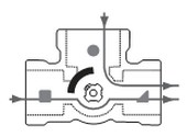 Les vannes 3 voies comprennent 3 orifices. Elles obturent alternativement 2 orifices sur 3, le troisième orifice appelé voie commune restant toujours ouvert.