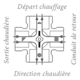 Les vannes 4 voies fonctionnent de la même manière que les trois voies mais en plus elles permettent de mélangeur une partie de l’eau sortante de la chaudière a celle qui viens des radiateurs, ceci afin de limiter l’usure de la chaudière par l’entré d’une eau tiède sur une corps de chauffe qui lui est a haute température.
