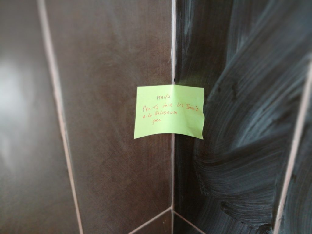 A ce moment j’ai constaté le présence de quelques post-it collés sur la faïence, comme c’est assez inhabituel de voir ça, je me suis empressé de lire ce qui était écrit sur un des post-it, que voici: