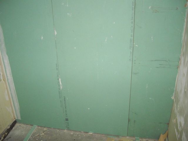 Pour bien faire il faudrait remplacer toute la cloison par des panneaux neufs, mais bien souvent le client n’accepte pas cette solution et alors on rafistole en posant juste une couche de plaques de plâtre Hydro, collé tant bien que mal sur l’ancienne cloison (enfin ce qui reste).