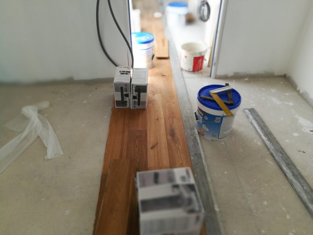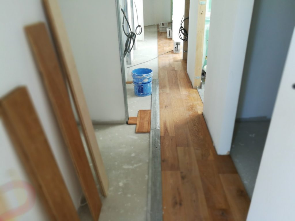 Si on a plusieurs pièces desservies par un couloir, il est peut être conseillé de démarrer une ligne droite afin de ne pas se faire avoir, car le parquet s’ajuste au mm, c’est très précis.