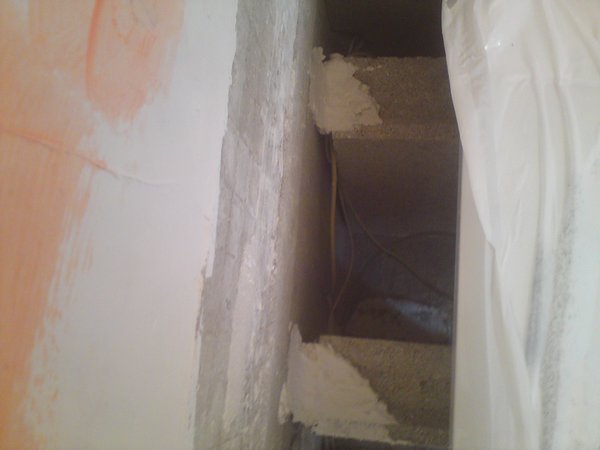 Il faut donc créer un coffrage pour supporter la paillasse, en ce qui me concerne, j’utilise des parpaings que je pose début, et que je recouvre d’une plaque de plâtre ou bois afin de maintenir le ciment.