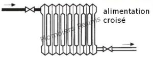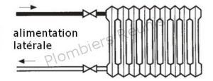 ce type d’alimentation est moins courante que la précédente, elle est aussi moins efficace, il arrive parfois que seul le premier élément du radiateur fonctionne, le seul avantage que ça présente est la possibilité d’ajouter des éléments sans avoir a modifier les tuyaux.