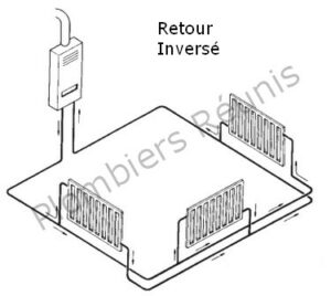 Voici enfin le circuit de chauffage avec retour inversé, qui est quasiment introuvable, certainement pour cause d’incompatibilités de certains locaux, il est aussi incompatible avec les distributions pieuvre, je pense que ces incompatibilités le rendent inutilisé dans les installations nouvelles et très rare sur les installations anciennes.