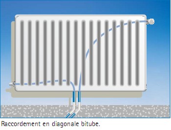 Comme on peut le constater sur les images suivantes, le premier radiateur est alimenté avec alimentation croisé, la dilatation des tuyaux est absorvé par le coude derrière le radiateur.