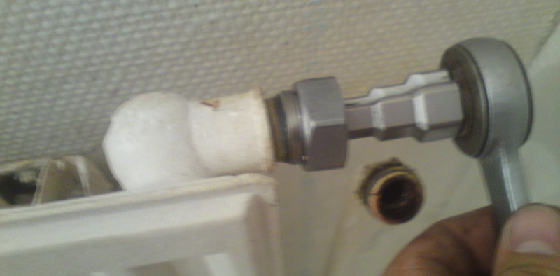 Pour cette opération nous avons besoin d’une clé de montage (certains l’appellent une carotte) ou encore tout autre outil permettant le vissage de ce raccords sur le radiateur, sur certains robinets il faut utiliser une clé Alen de 12 mm.