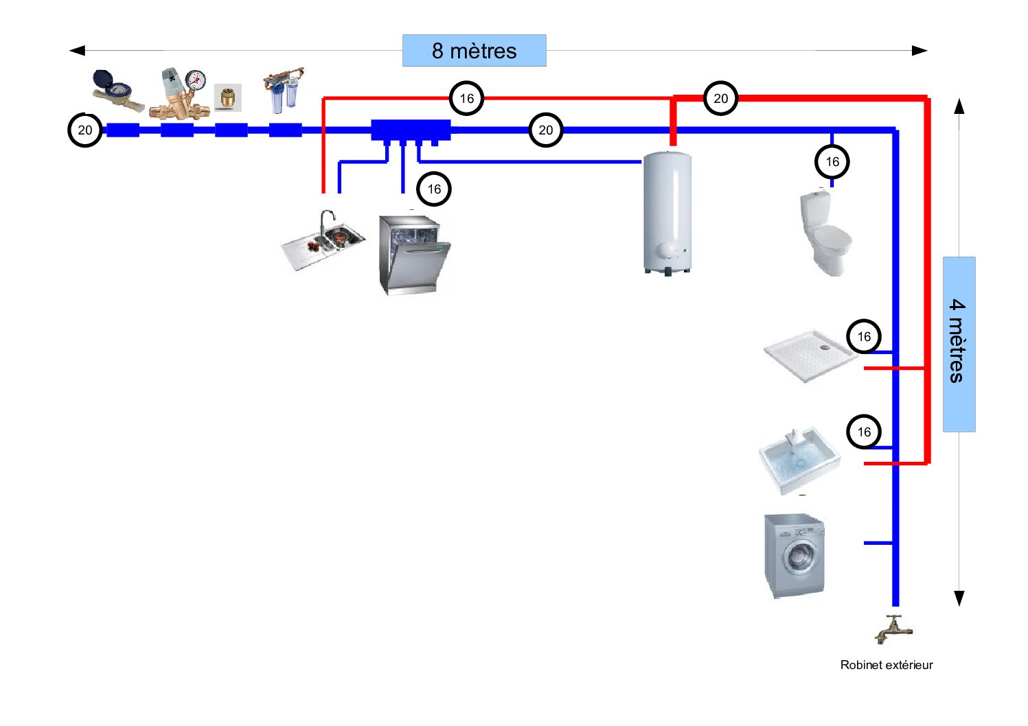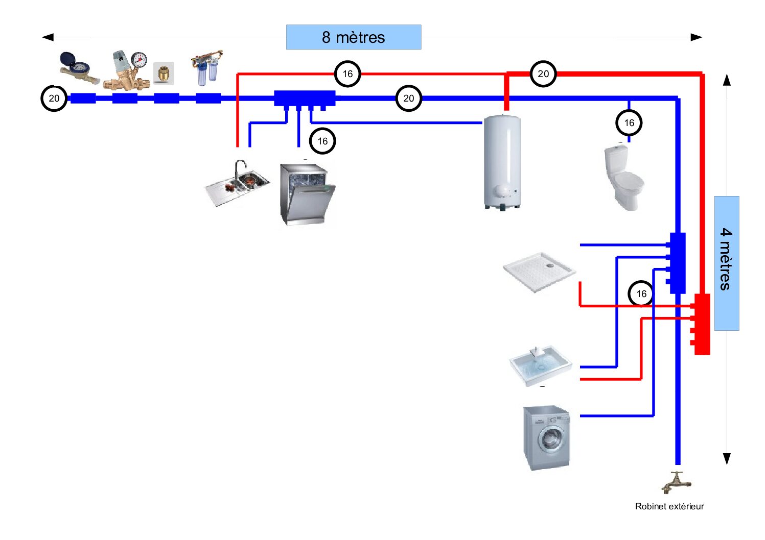 julduf wrote:Je me demandais également s’il était possible de tout mettre en diamètre 20 par simplicité. Y a-t-il un intérêt ou est ce déconseillé?A vrais dire il n’y as pas de contre-indication de sur-dimensionner les diamètres des installations, mais c’est déconseille dans certains cas, particulièrement sur l’eau chaude qui sera beaucoup plus longue a arriver aux points de puisage (donc pertes accrues), mais aussi un niveau des raccordements du wc et des robinets vous aurez de tubes trop épais ce qui n’est pas esthétique si votre installation est apparente, ainsi des nombreux raccords seront nécessaires pour certains raccordements.