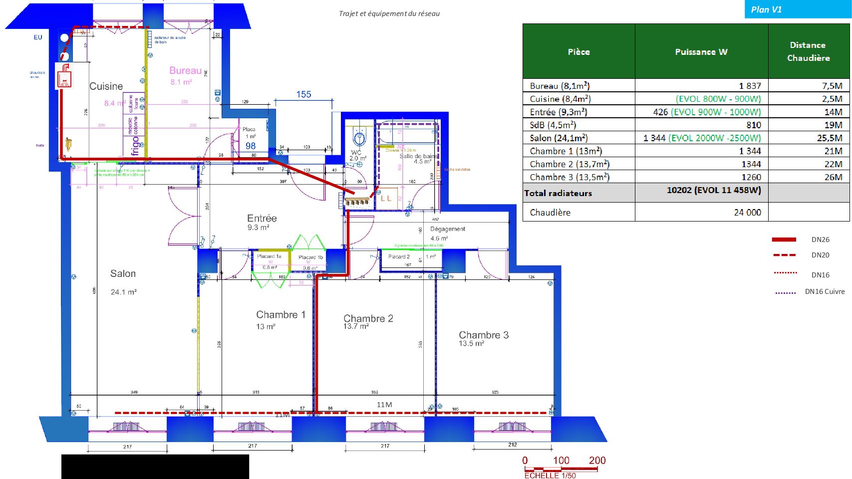 • Le dimensionnement DN26 / DN20 / DN16 est-il adapté aux puissances et distances ?