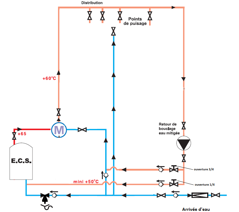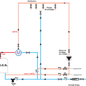 J’ai un peu du mal à comprendre l’histoire des vannes de réglages mais j’imagine que le principe est que le retour d’eau mitigée est forcément égal ou inférieur à la température de réglage du mitigeur. Ce qui évite de renvoyer trop d’eau via la production d’ECS ? C’est ca ?