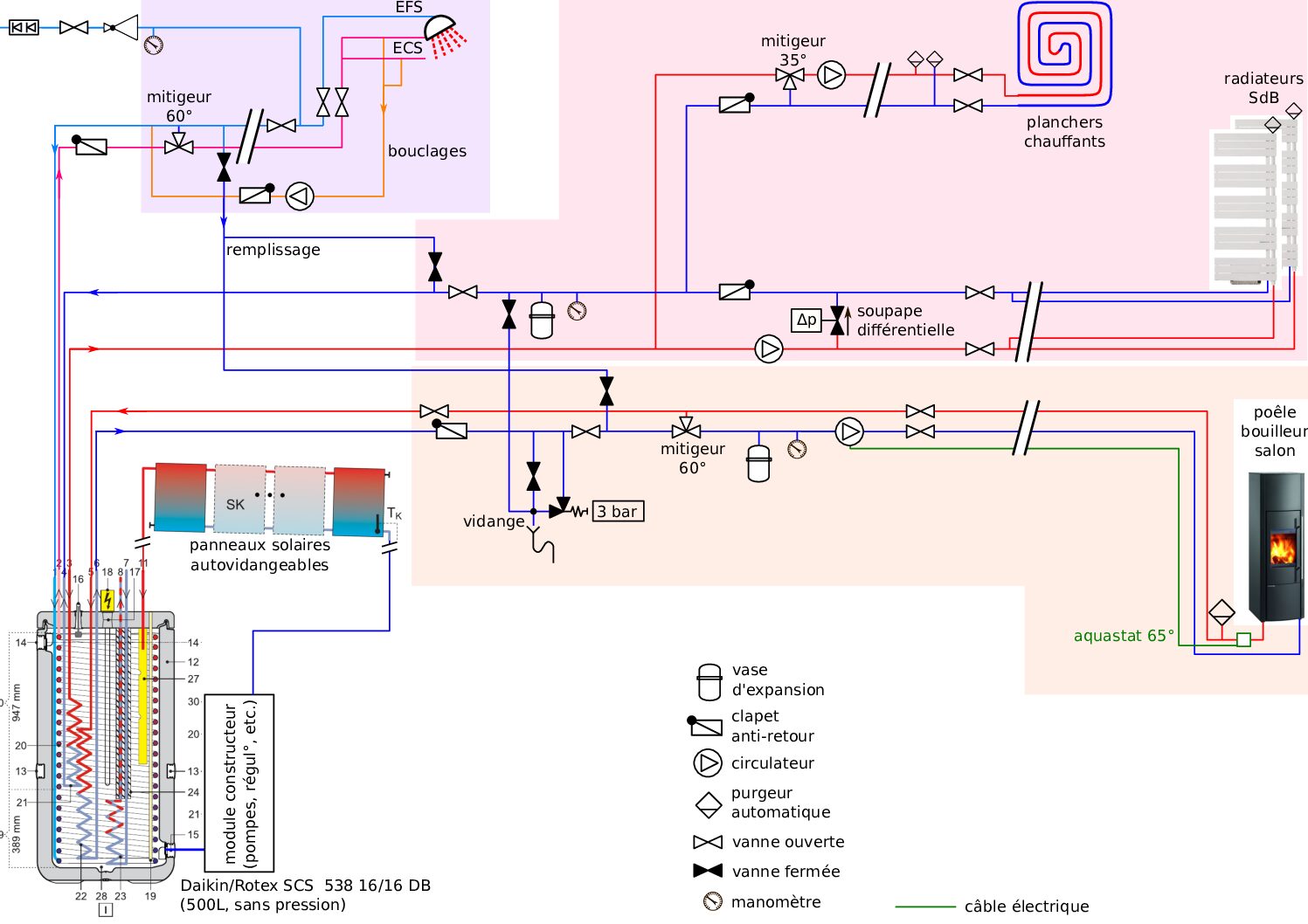 Suite à vos conseils, j’ai déplacé la soupape 3bars et baissé à 50°C la température ECS (mais je croyais qu’il valait mieux 60° pour éviter les légionelles, du coup je ne sais plus).Si je comprends bien votre message, il faut deux soupapes 3 bars sur le circuit entre ballon et bouilleur ?