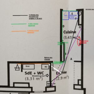 Pour le materiel je pense que le multicouche est certainement la meilleure solution car il peut etre utilisé en apparent ou encastré, seule condition, ne pas noyer les raccords dans les murs ou les sols.Merci pour ta réponse et les précisions. Je mets en pièce jointe le plan du studio avec l’affectation des pièces concernées, l’emplacement des points d’eau actuels et futurs, ainsi que des éléments comme la chaudière et les canalisations. J’espère que cela pourra aider à mieux comprendre la configuration.