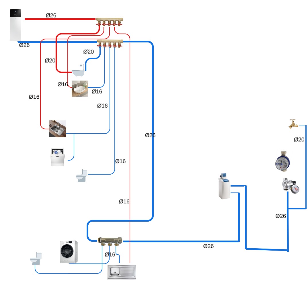Je ne sais pas s’il faut mettre du multicouche de 20 ou 26 mm à partir de l’adoucisseur jusqu’aux 2 nourrices et la PAC .