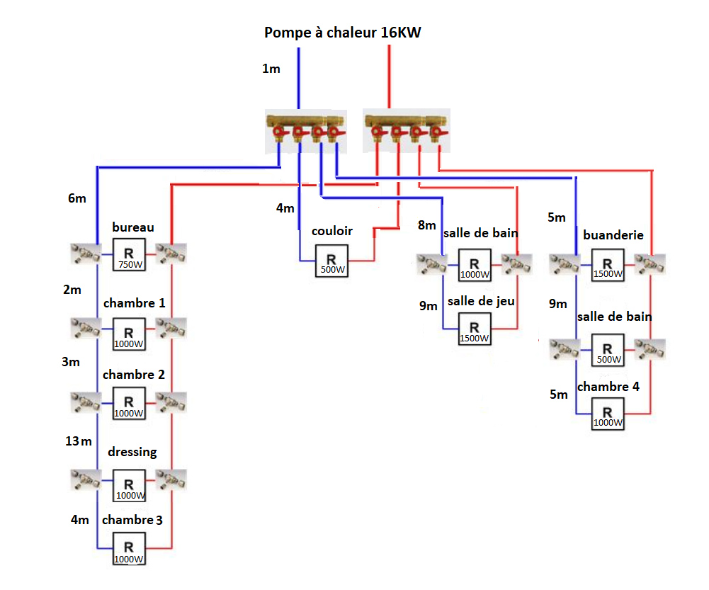 Réseau de gauche + le deux de droite, 16/20 entre collecteurs et jusqu’à dépasser l’avant dernier radiateur puis 12/16 pour le dernier