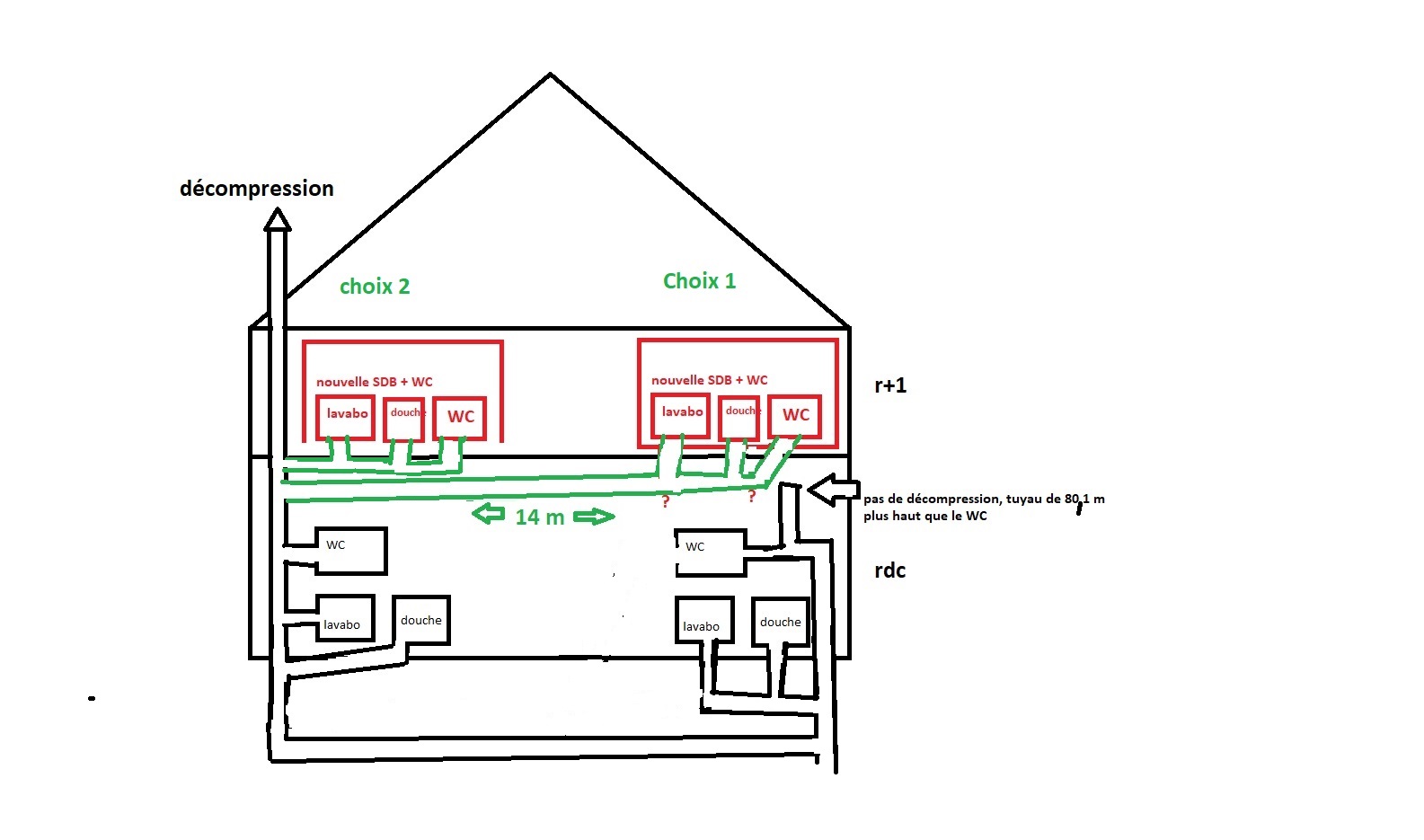 Dans un 1er temps j’avais pensé faire l’espace SDB+WC au-dessus de ma 1ere SDB du RDC (choix 1) car plus près de l’évacuation.