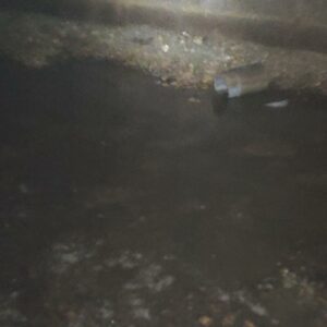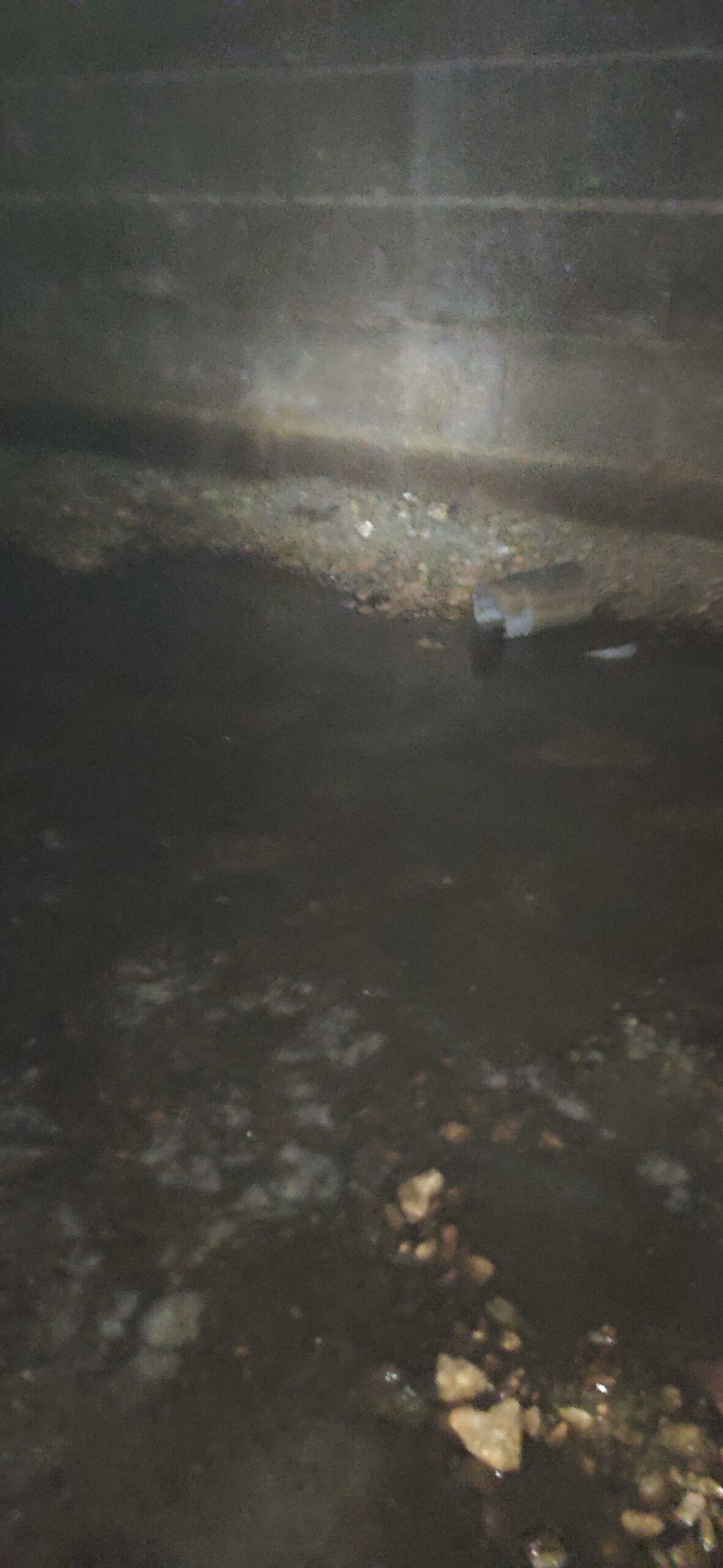 Le tuyau d’évacuation de la maison est cassé et est au sol… La cuisine, salle de bain et wc se rejoignent pour s’écouler sous le garage. A priori le plus gros des eaux vannes est encore dans le tuyau mais il y a des grosses flaques d’eau stagnante à plusieurs endroit, ça grouille de moustiques.Une fois bien équipé (FFP3 à cartouche, bottes, lampe frontale et combi, j’ai fait le tour du vide sanitaire pour comprendre et voir l’étendue des dégâts.