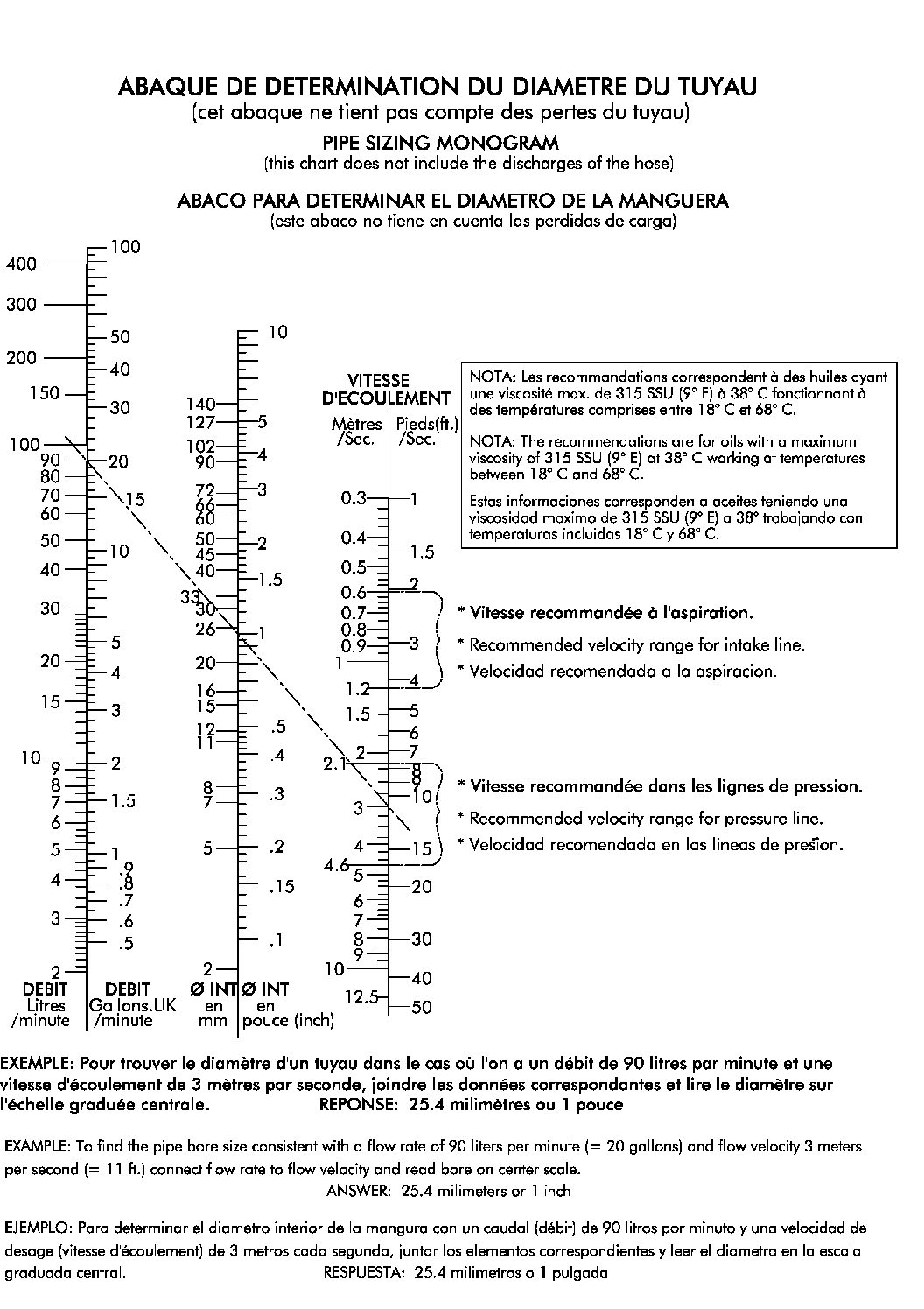 Une abaque permettant le calcul des tuyauteries en fonction du débit et de la quantité d’eau a la minute.