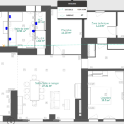 J’ajoute le plan de la maison, pour aider à comprendre les contraintes. Le carré rouge c’est l’emplacement de la chaudière avec le(s) ballon(s) tampon. En bleu, les points de puisage, la croix orange correspond à l’emplacement de la nourrice d’ECS.