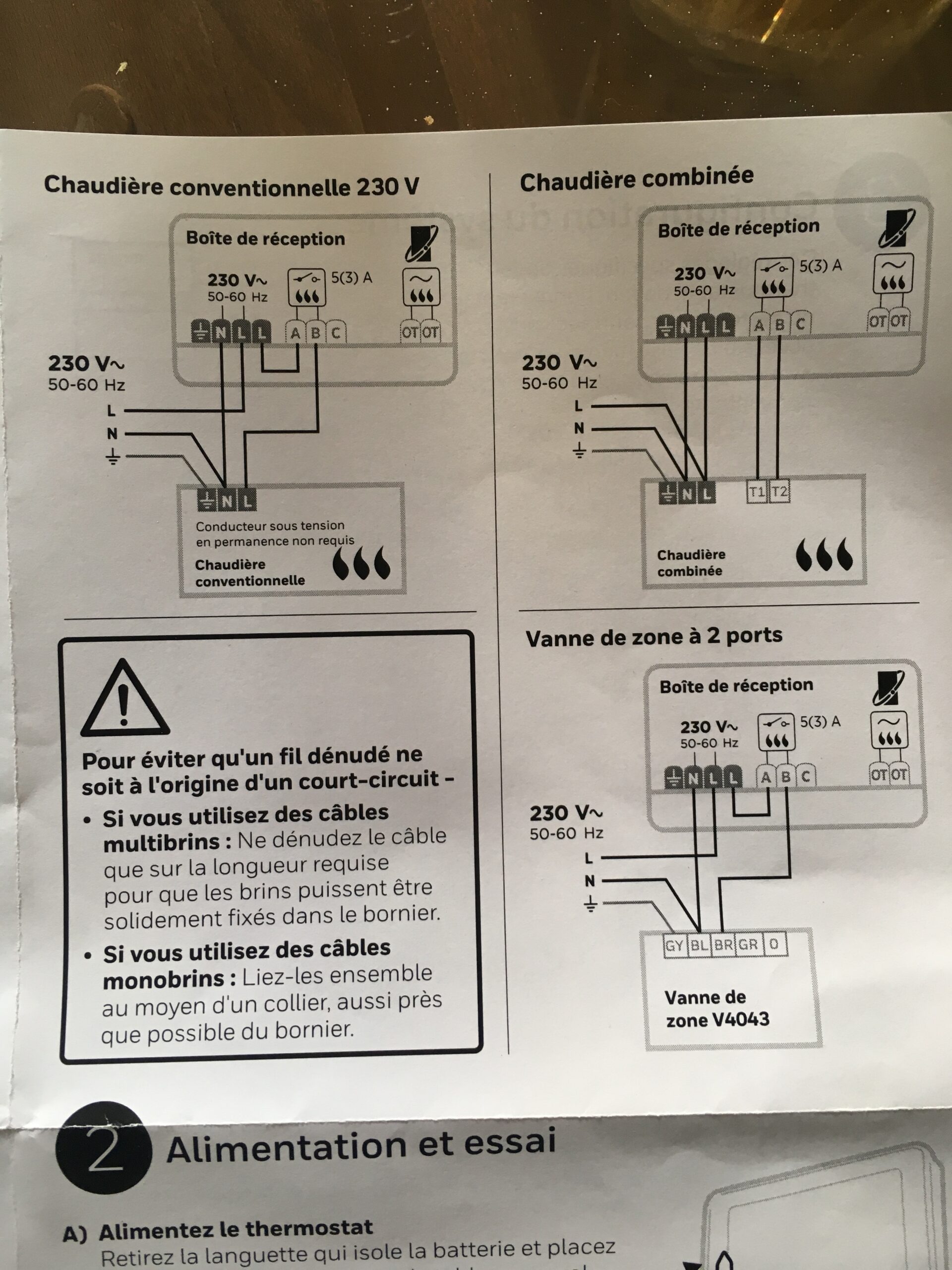 Puis les deux fils jaunes sur les borniers A et B du thermostat conformément au premier dessin de cette image.