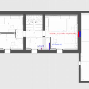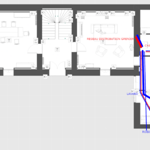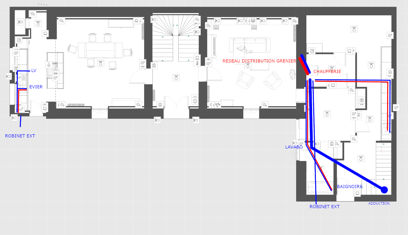 Nous venons d’acquérir une maison très ancienne sur deux étages avec une extension accolée, ou les réseaux sont repiqués et je voudrais partir sur un nouveau réseau en cuivre recuit avec des vannes. Dans un premier temps, nous n’aurons les moyens que de faire la partie maison, tous les réseaux de l’extension seront faits plus tard, mais je les ai indiqués pour avoir une vision d’ensemble.