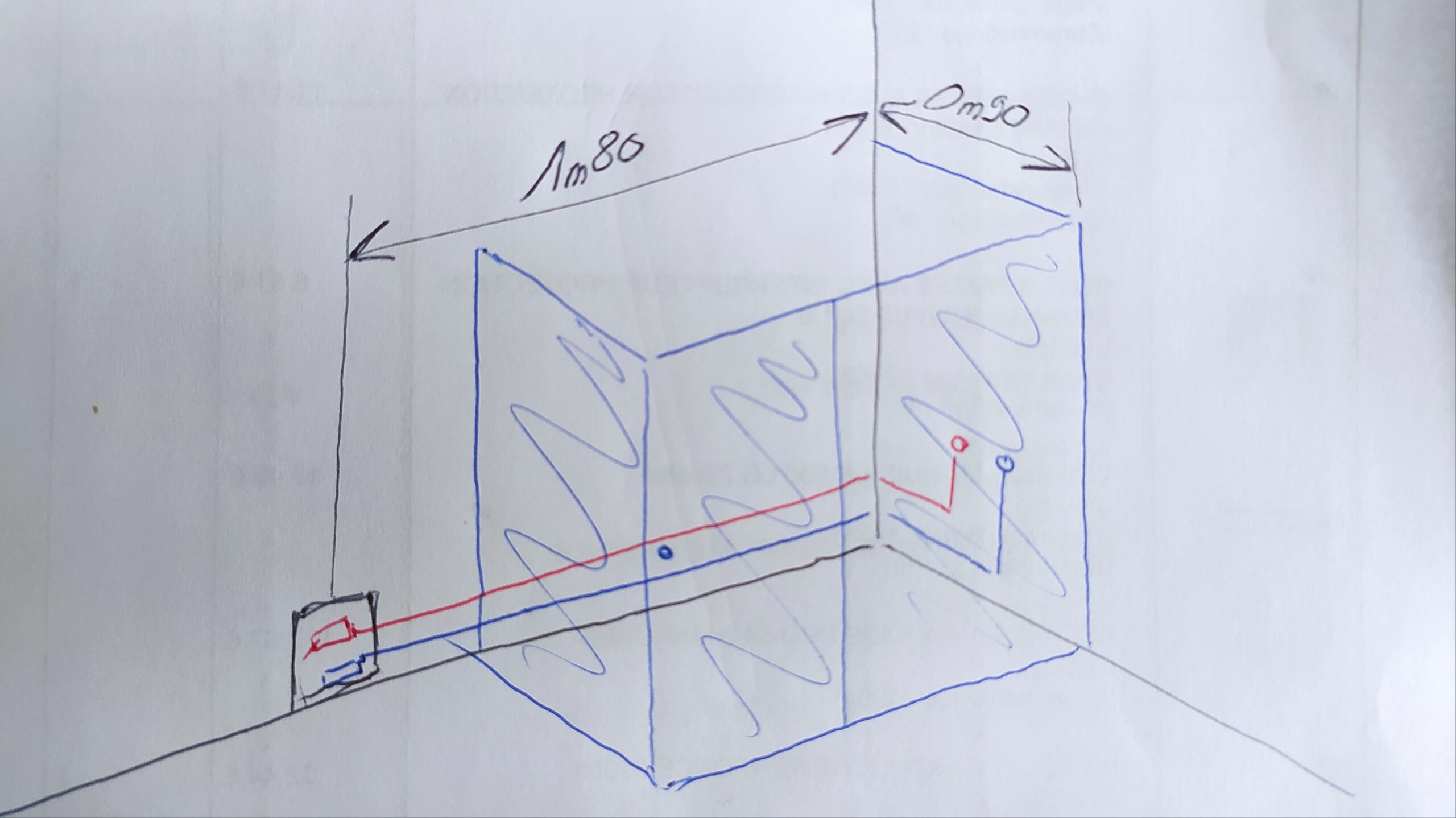 À l’étage chez moi j’ai de la tomette (ancien atelier), j’aménage une suite parentale. Je ne veux pas faire de tranchée pour enterrer les gaines, je garde la tomette bien chaude en hivers grâce au poêle à bois en dessous, je veux passer les gaines horizontales dans le doublage placostil à 20cm du sol. 3m linéaires à tout casser pour aller des nourrices dans le doublage jusqu’au mitigeur de douche.
