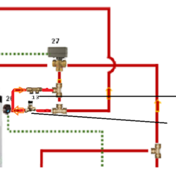 Voilà ce qui devrait faire en sorte que le circuit de chauffage soit prioritaire par rapport au ballon, la vanne à pression différentielle réglable provoque une perte de charge plus importante coté ballon pour que celui.ci ne chauffe que quand la vanne 3 v de chauffage 18 se ferme.