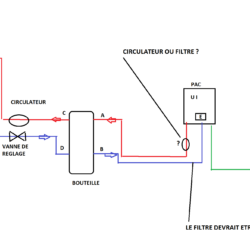 Sans un circulateur au depart de la bouteille, vous aurez toujours des difficultés, car le flux de la pompe va boucler dans la bouteille… Et la partie entre la bouteille et le circuit fonctionne par thermo dynamie.