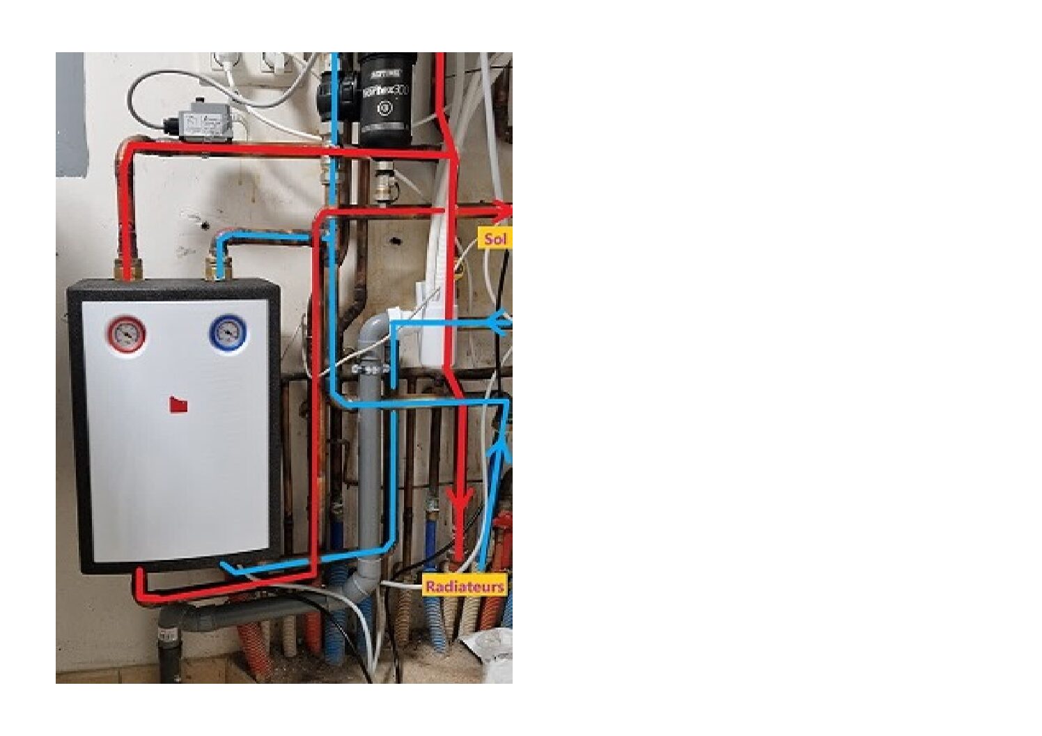 Telle que vous voyez l’image, en partie supérieure a gauche vous avez une sonde de température, c’est cette sonde qui capte la température de départ vers le plancher chauffant , et informe la régulation, pour que la régulation puisse activer la vanne trois voies en ouverture ou fermeture selon les besoins.