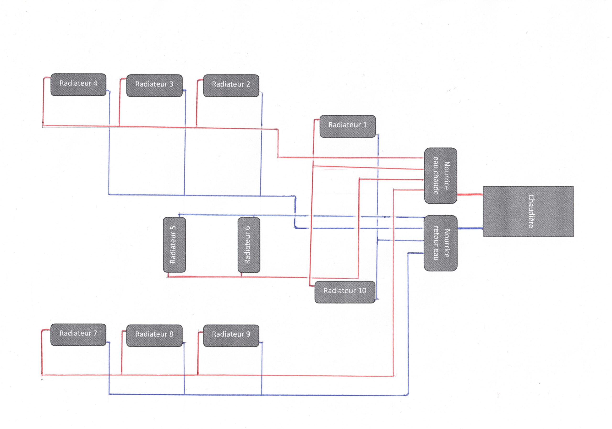 Ma maison est de plain-pied. Le sous-sol accueille les radiateurs 1 et 10, tandis que les radiateurs 2 à 9 se trouvent au rez-de-chaussée.
