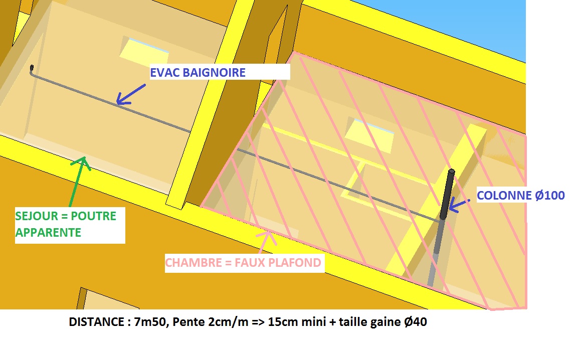 Mes WC et salle de bain de l’étage seront éloigné donc si je prend l’exemple de ma baignoire: Je souhaite la raccorder à ma colonne Ø100 (qui n’existe pas encore), mais j’ai un problème de distance. Qu’en pensez vous ?Je précise que aujourd’hui au RDC j’ai : Baignoire + douche + WC.