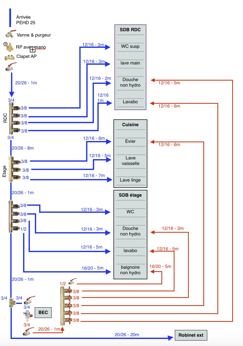 Pour remettre la maison au confort moderne, je prévois au RDC 1 salle de bain (avec l’arrivée d’eau) entourée de WC d’un côté et d’une cuisine de l’autre. Au dessus, il y aura une autre salle de bain avec WC et le ballon d’eau chaude juste à côte. L’implantation est donc assez ramassée et à part un robinet extérieur (qui devra en plus traverser un garage), les distances en tube sont assez faibles.