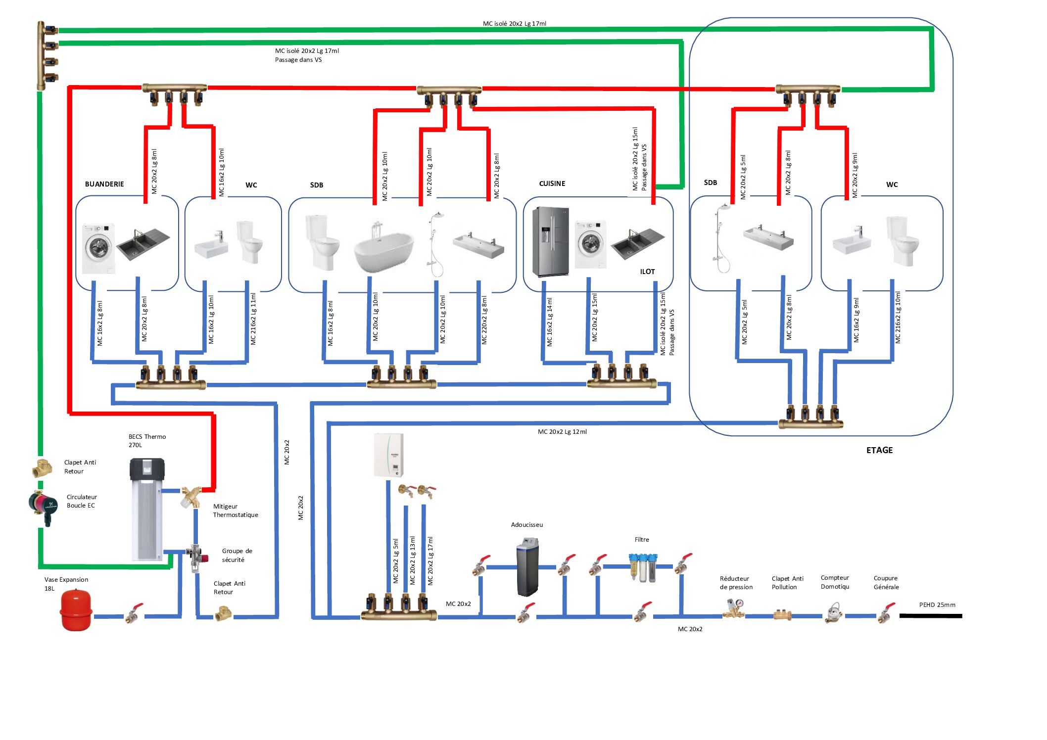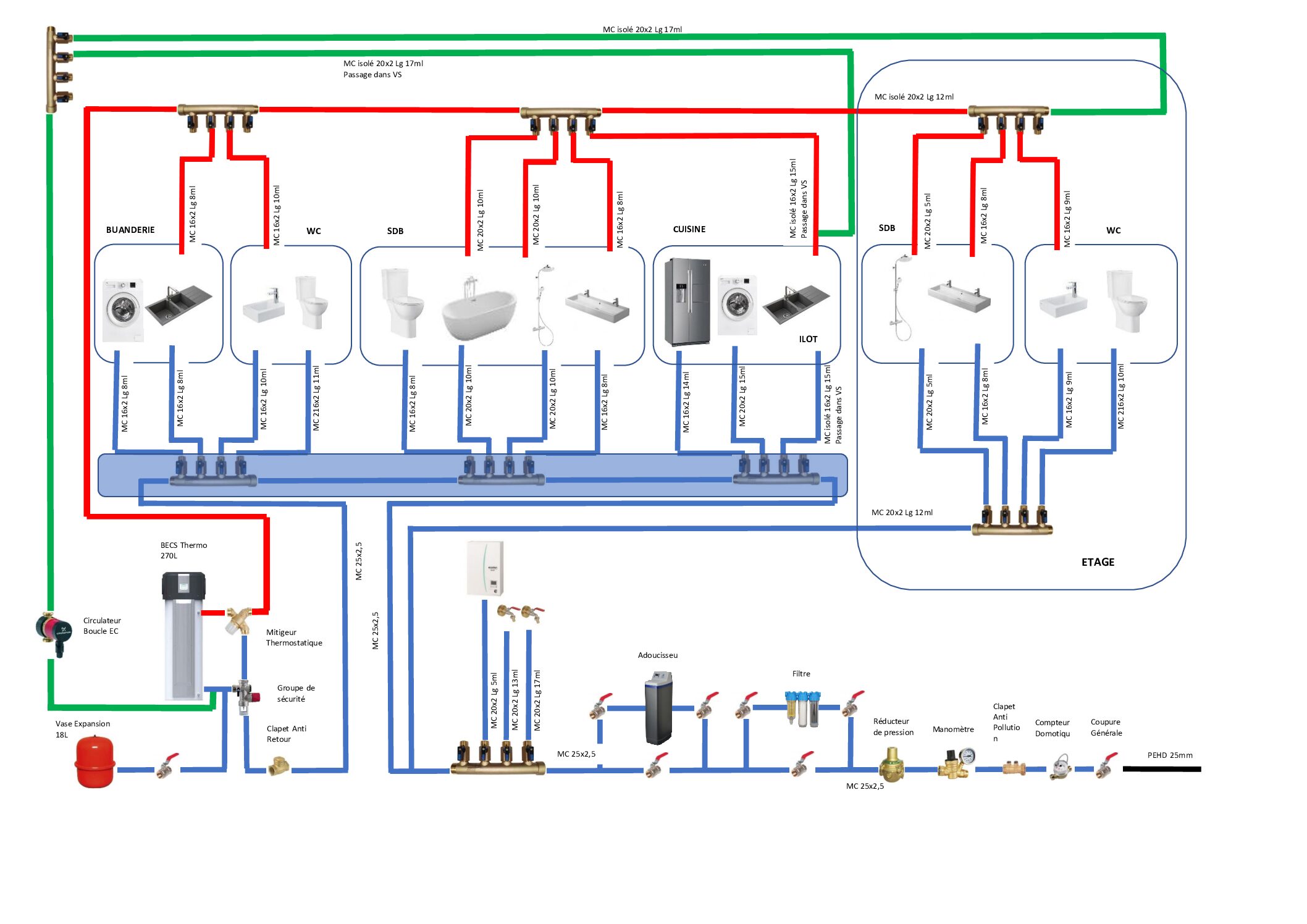 Pour les nourrices en fait, il faut comprendre que toutes ces nourices seront peut etre regrouper en une seule puisque de l’arrivée jusqu’au ballon, tous les matériels seront situées dans la même pièce (je conviens que mon schéma n’est pas clair sur ce point) seul la nourrice de l’étage sera déporté.