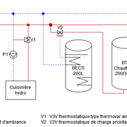 Ne souhaitant pas que la chaudière fioul puisse alimenter le ballon ECS et le ballon tampon, j’ai séparé les réseaux: Le réseau existant entre la chaudière et les radiateurs et l’extension avec le poêle, le ballon ECS et le BT. Dans la réalité, la pompe P2 sera à proximité du piquage sur l’existant.Dans cette configuration, on se retrouve dans une configuration identique au blog en copie dans mon premier post. En cas de réduction des besoins des radiateurs. le débit complémentaire ira dans V2. En fonction de la position de V2, les calories iront vers le BECS ou le BT.