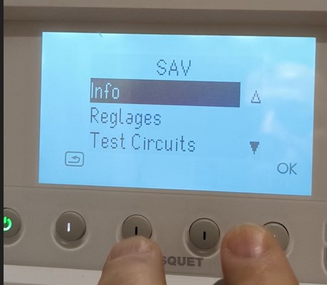 une fois dans ce menu « SAV » nous sommes sur « info » il faut alors appuyer sur « OK » puis encore « OK » pour aller sur la page 3/3.
