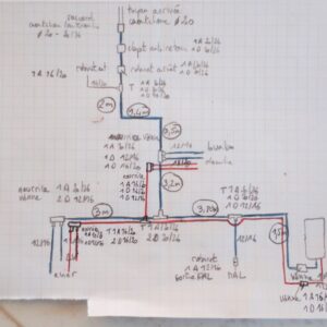 Là j’ai chois un tuyau général de 16/20 (j’ai lu que c’était mieux car moins de déperdition d’eau chaude) qui repart dans l’autre sens sur le même schéma que l’eau froide.